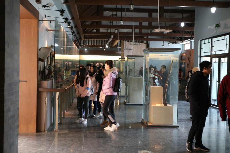 上午8点整,师生团准时出发。9:30左右,师生团到达焦庄户地道战遗址纪念馆。焦庄户地道战遗址纪念馆位于北京市顺义区东北燕山余脉歪坨山下,距北京60公里。团队首先参观了纪念馆中陈列的抗战遗留物品,有农具、武器、生活用品等各式各样焦庄户抗战时期遗留下来的物品,以及历届领导人来访考察的影像资料。随后,师生团进入830米长的地道遗迹,切身感受地道的构造。地道中光线昏暗,但在长期的修缮下四周平整,曲折回环、高低错落。在地道中,老师同学们不时发出惊叹,感慨地道的纵横交错、四通八达,材质装备极简陋,构思设计却极巧妙,掩体、休息处、指挥所、会议室等一应俱全,同时与水缸、猪圈、水井等农家设施形成上下呼应。地道遗址是抗战时中国军民以少胜多、以弱制强的见证,也是抗战时期人民群众智慧与勇气的体现。