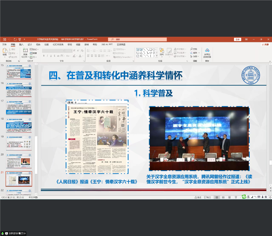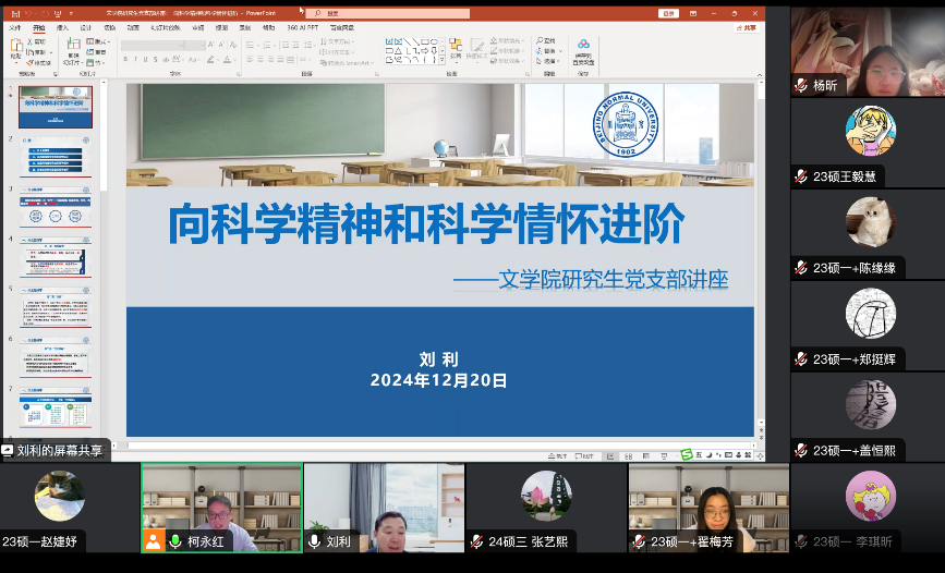 2024年12月27日晚,必威betway西汉姆古代汉语教师党支部与2023级硕士第一党支部联合开展共建活动,邀请古代汉语教师党支部的刘利老师主讲线上党课——“向科学精神和科学情怀进阶”。活动由古代汉语教师党支部书记柯永红老师主持,来自2023级、2024级的80余名硕士研究生党员和入党积极分子共同参加了此次党课学习。
