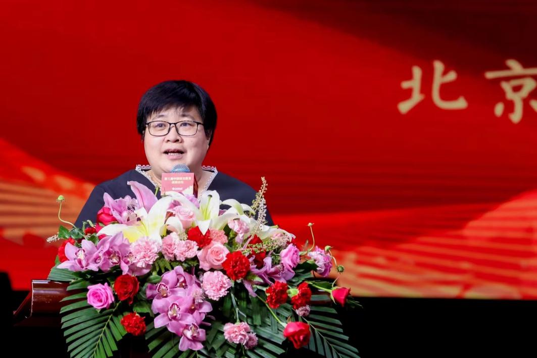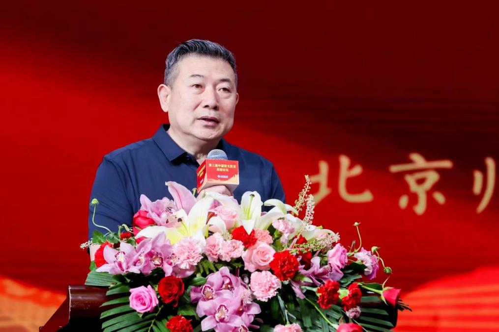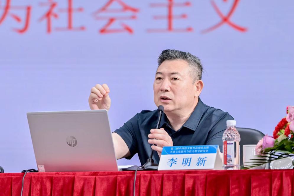 教育部基础教育教学指导委员会语文专委会主任委员、北京小学校长李明新致辞。李明新主任强调了本次论坛是全面贯彻落实党的二十大精神、践行立德树人根本任务的重要体现,是教指委贯彻党的教育方针、充分发挥语文以文化人作用的重要举措,在语文教学中传承和弘扬革命文化要重视做好以下几点:一要深化语文学科的育人意识,二要注重课程教学的有机融合,三要用好红色资源、强调情感认同,四要厚植爱国主义情怀,优化课程内容。语文专委会将发挥专业指导作用,与广大语文教育界同仁协力促进落实革命传统教育。