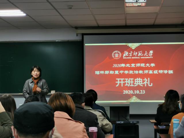 接着,锡林郭勒盟教育局师资科科长金丽讲话。金科长首先对北京市教委、北师大必威betway西汉姆以及发展合作中心提供的学习平台与机会表达了真诚的谢意。她在讲话中提到,今年全盟思政课教师培训以网络培训为主,此次在“京锡合作”项目的帮助下,60位思政教师相聚北师大,也为全盟教师交流提供了难得的机会。金科长希望老师们能珍惜本次研修之旅,与专家、教授积极交流沟通,吸取知识、开拓视野、提升能力,成为更加优秀的教育者,也祝愿各位老师在北京生活愉快,学有所获。