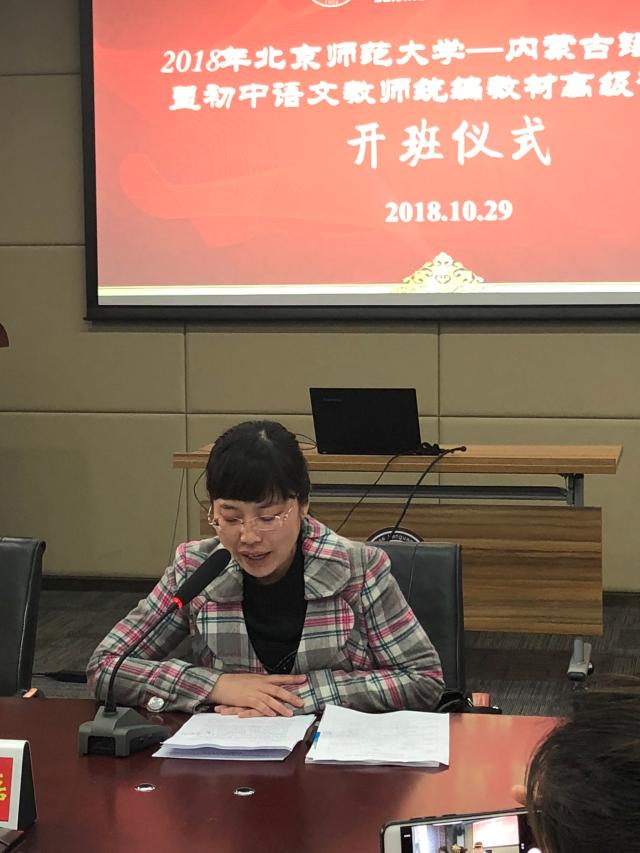随后,研修班班长杜佳磊老师作为学员代表讲话。杜老师首先向北京市教委、锡盟教育局、北师大必威betway西汉姆等单位对这次活动的支持表达了感谢,随后,她谈到了教育、教师的重要性。杜老师将语文教师比作人类灵魂的工程师,她为自己是一名语文教师感到自豪。同时她还指出,教育承载着无数家庭的美好希望,关系着民族和国家未来发展,因此,如何更好地发挥教师传道、授业、解惑的作用,如何让每一位学生乐学、善学、会学,如何以教材为抓手提升学生的语文能力等课题都是值得每一位教育工作者去认真研究的,同时,也正是在教学过程中遇到的种种难题和困惑把老师们带来了这里。这次培训也科学地设计了课程,从教育理论学习到优秀教师课程听评,领导和老师们为之量身打造的这场学习盛宴值得期待。她代表老师们承诺,将严格遵守纪律,积极听好每一节课并反思自身教学的不足,做到学有所获。