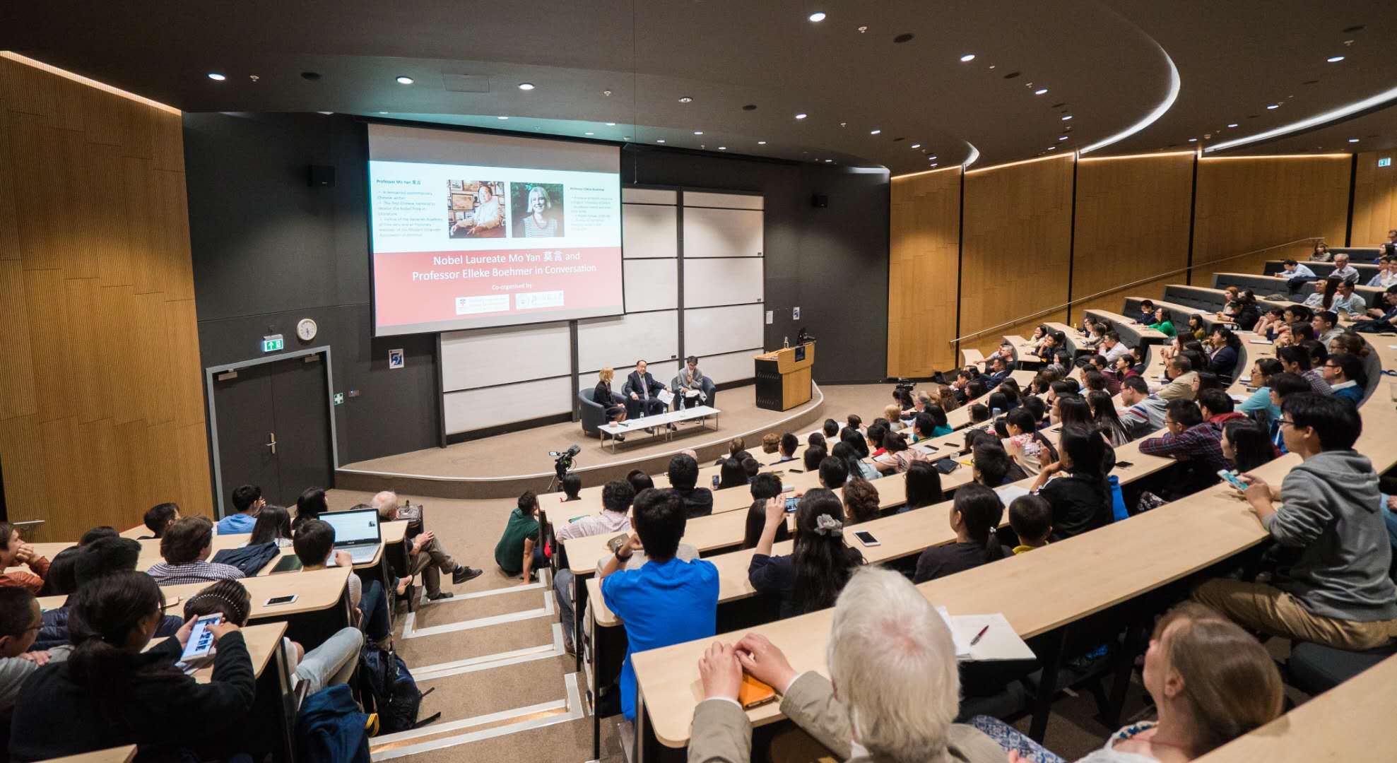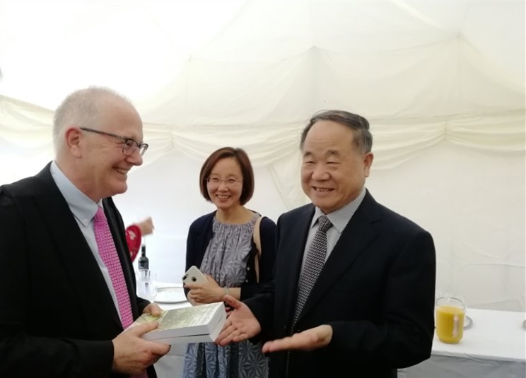 莫言教授一行在牛津大学摄政学院院长Robert Ellis、牛津大学摄政学院教授Lynn Robson、牛津大学全球发展展望中心主任Shidong Wang、牛津大学世界文学系系主任Ros Ballaster的陪同下参观了摄政学院和世界文学系,就多个合作意向形成共识,并与世界文学系师生进行了座谈。随后,莫言教授就自己的文学创作经历和世界文学的发展主题做了演讲,并与英国作家、牛津大学人文研究中心主任Elleke Boehmer进行了高端对话,该活动吸引了来自牛津大学和英国其它高校的师生近400人。