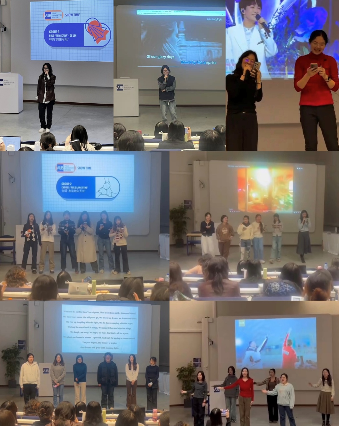 在才艺表演环节,同学和助教们展现了丰富多彩的才艺,第三组林鸽同学深情演唱歌曲《如果可以》,第一组同学则为大家带来了充满活力的集体手势舞《一起向未来》,助教张玉婷老师紧接着表演了一段灵动翩然的独舞,第六组王慧淼同学随后带来了一首经典英文歌曲《Someone Like You》,第四组同学通过诗朗诵《The Year》表达了对过去一年的回顾与对未来的期待,助教沈月、张玉婷老师合唱了温馨美好的《一路生花》,第五组带来了轻快动感的歌曲《Lemon Tree》,第二组同学则为大家真挚演绎了经典合唱曲目《友谊地久天长》。会场氛围轻松愉悦,情感真挚流露,展现了师生之间深厚的默契与情谊,给这次难忘的比利时之旅画上了完美的句号。