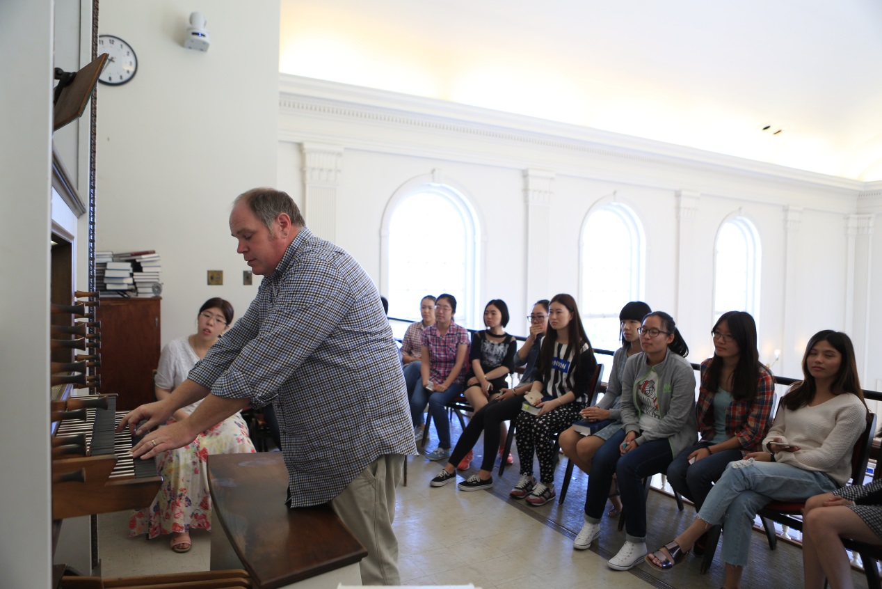 7月13日下午,学生们在阿卡迪亚大学的课程学习正式开始。项目课程主要包括《北美文化与历史》和《学术英语》。每天上午,学生们在各位教授、学者的带领下学习加拿大当地的历史、文化知识。课堂教学与户外实践教学紧密结合,每节课的内容都丰富多彩,形式各具特色。地理学教授Dr.Rob Raeside在科学中心为学生讲解当地景观的形成、地质构成等相关知识,并带领学生通过查阅长廊橱窗中展示的各类样本加强对知识的掌握;教士Rev.Timothy McFarland在教堂里讲解了加拿大的宗教历史和教堂各组成部分的功能意义,John Scott现场示范管风琴的弹奏;生物学教授Dr.Graham Daborn带领学生走访当地海湾堤岸,观察潮汐的变化、采集不同的生物。还有历史、化学、人体运动学等课程同样精彩,让学生们在学习过程中进一步加深了对加拿大历史与文化的认识,也感受到了截然不同的教学方式。