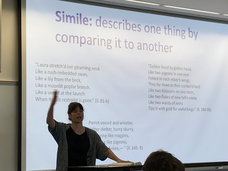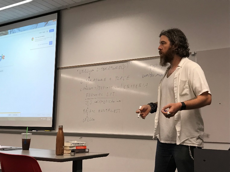 接下来,同学们纷纷投入到了学习生活中。俄勒冈的课堂精细而有趣,每个课堂都有五位助教,负责组织课堂讨论,以及课后回答同学疑问,同学们也相应被分成五组。教授们的课堂风格鲜明,英语论文写作课上Malewitz教授借助托尼·莫里森的短篇小说《宣叙》指导同学们文学评论的写作技巧;美国原住民文学课上Bernardin教授通过分析D’Arcy McNickle的小说《Train Time》,讨论了美国原住民文学中原住民与外来移民者的文化冲突;文学作品精读课上Davison教授通过厄普代克的短篇小说《A&P》解读美国现实主义与现代主义小说的风格特征与阶级思考,Ward教授则选取了一则名为《Goblin Market》的长篇诗歌,分析其写作技巧、主要意象的象征意味,以及其中对资本主义的些许隐喻;俄勒冈当地文学课上Moore教授带领同学们阅读小说《永不让步》中的片段描写,又联系当地环境与人文特征,介绍俄勒冈文学与作家群……每一堂课都有着明确的主题和思路。在教授们的鼓励机制下,同学们的积极性也极其高涨,课堂上时而有激昂的讨论,时而迸发出观点契合的开心笑声。第一周的学习时光匆匆结尾,同学们在身体的时差中认真地预习阅读材料,朋友之间也互相帮助促进理解;茶余饭后的悠闲时光,却总是看到大家翻材料查单词的身影。