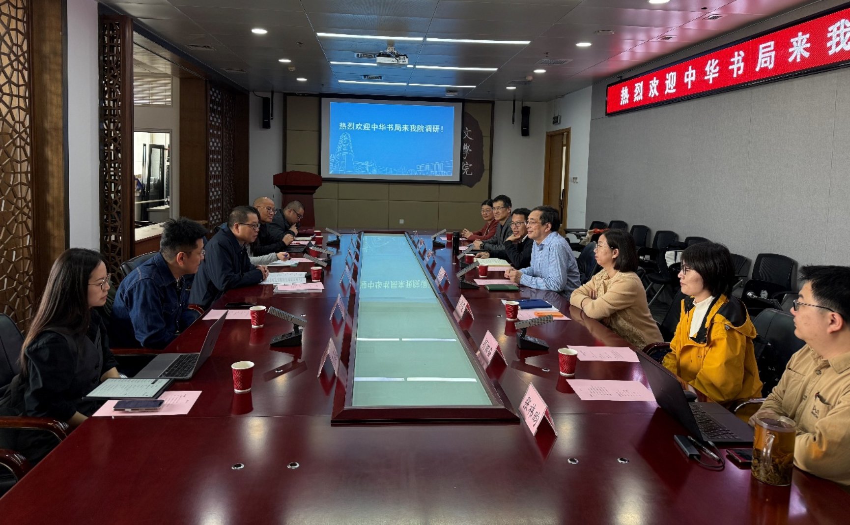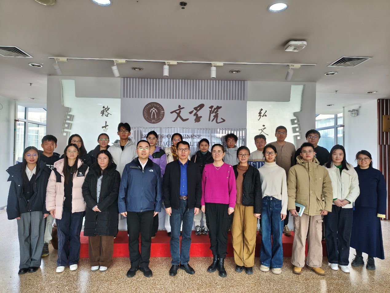 2026年3月16日下午,中华书局副总编辑俞国林率语言文字编辑室副主任张可、文学编辑室副主任刘明、哲学编辑室副主任石玉、文学编辑室编辑汪煜、总编室质检专员王雨柔一行6人来访我院调研,进行工作交流。交流会由学院院长王立军主持。
