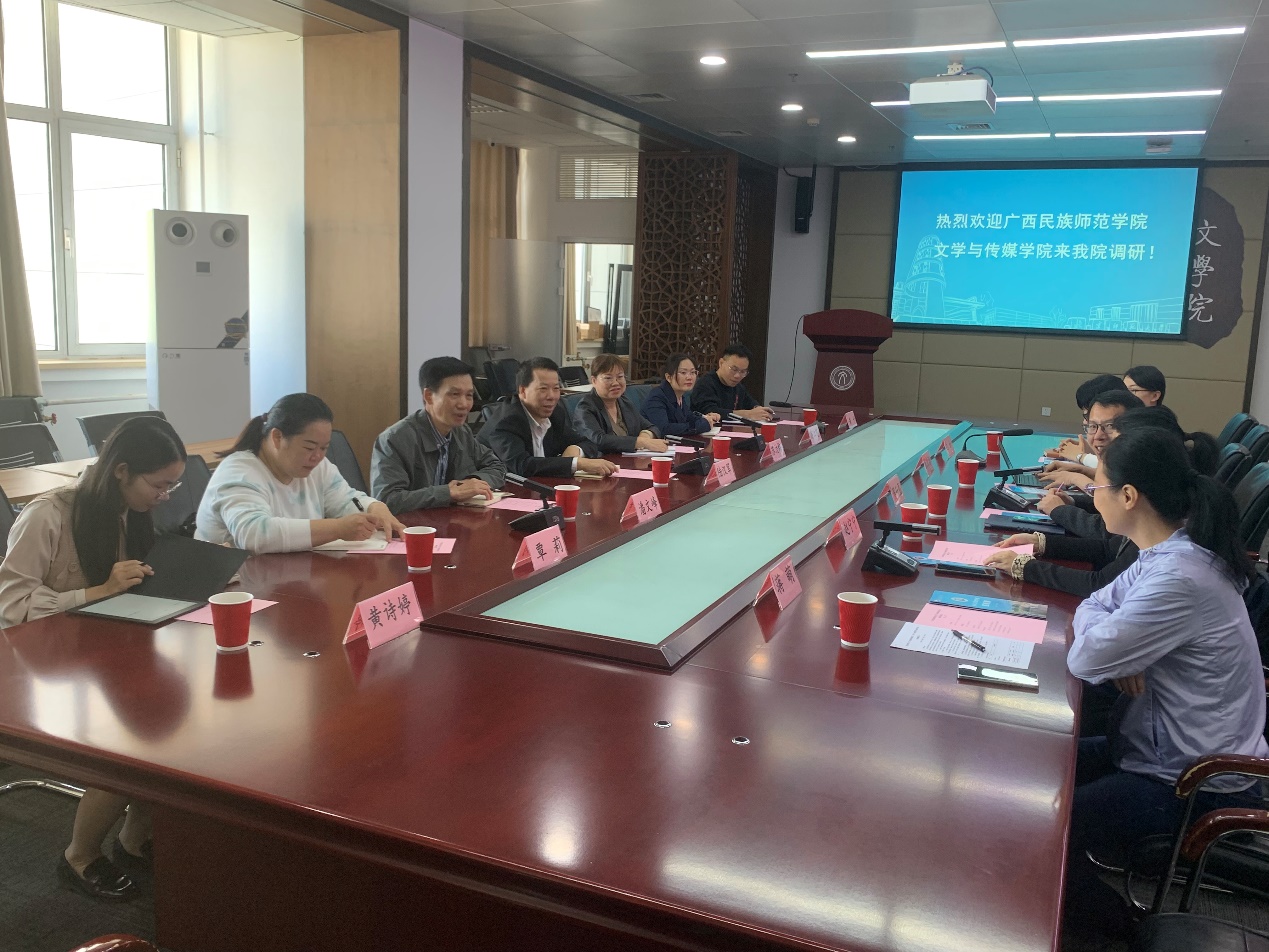 2023年10月26日上午,广西民族师范学院文学与传媒学院陆汉军院长等一行前来我院调研。交流会由党委书记周云磊主持。