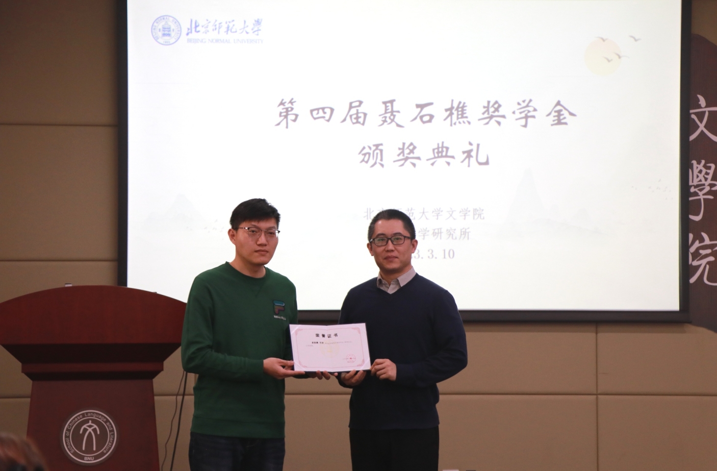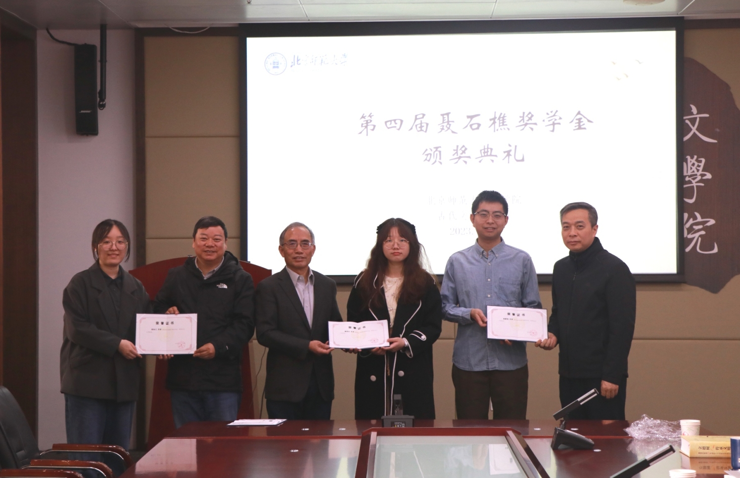 聂大昕老师首先肯定获奖同学的努力与成果,希望古代文学专业研究生砥砺前行,不负韶华,让聂石樵先生等前辈学者优良的治学传统薪火相传。康震、过常宝和郭英德三位老师分别致辞,对聂先生的学术热情与治学态度表示敬意,鼓励同学们不断努力、守正出新。致辞结束后,本届获奖博士生崔振鹏、硕士生詹莞如、陈耘之、谢蒙恩依次登上讲台,聂大昕、康震、过常宝和郭英德老师为他们颁发获奖证书并合影留念。