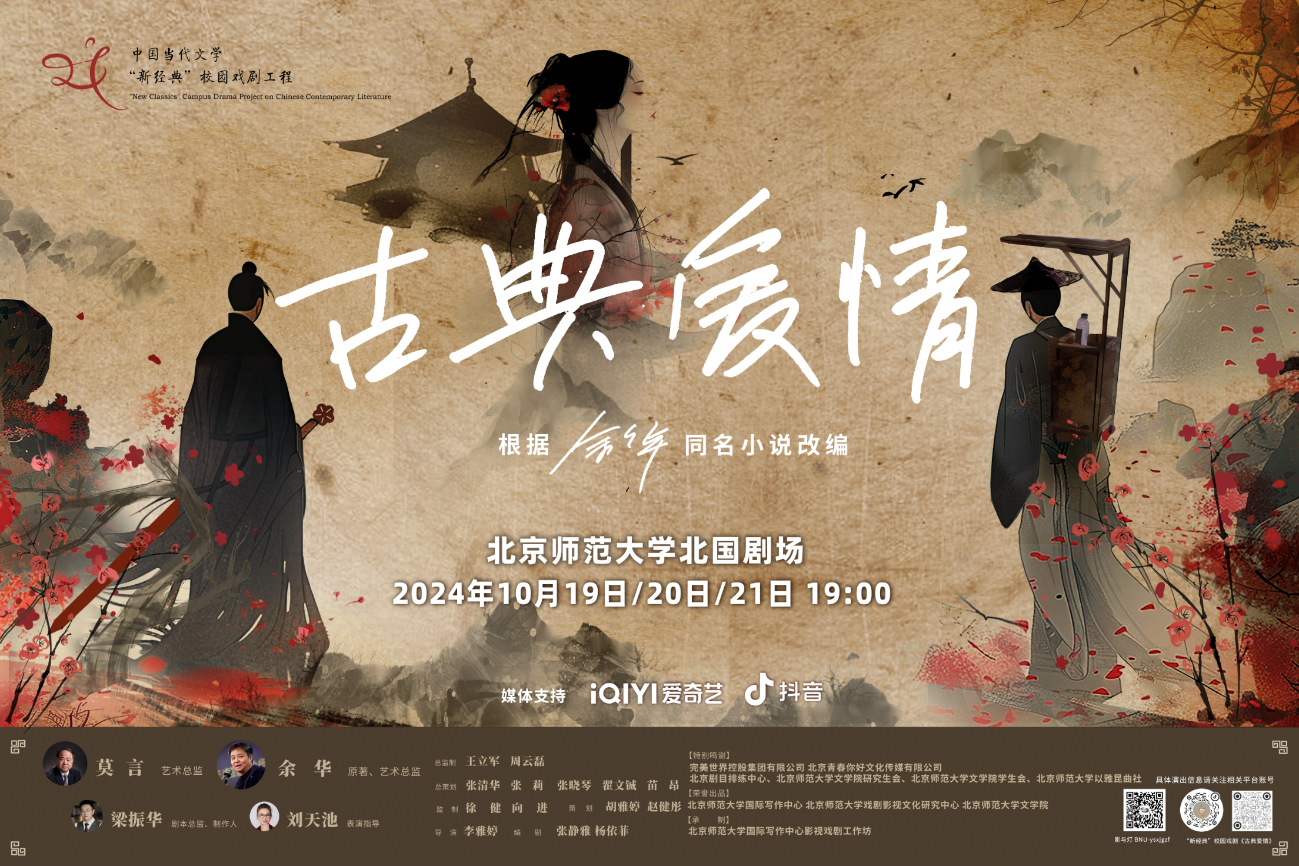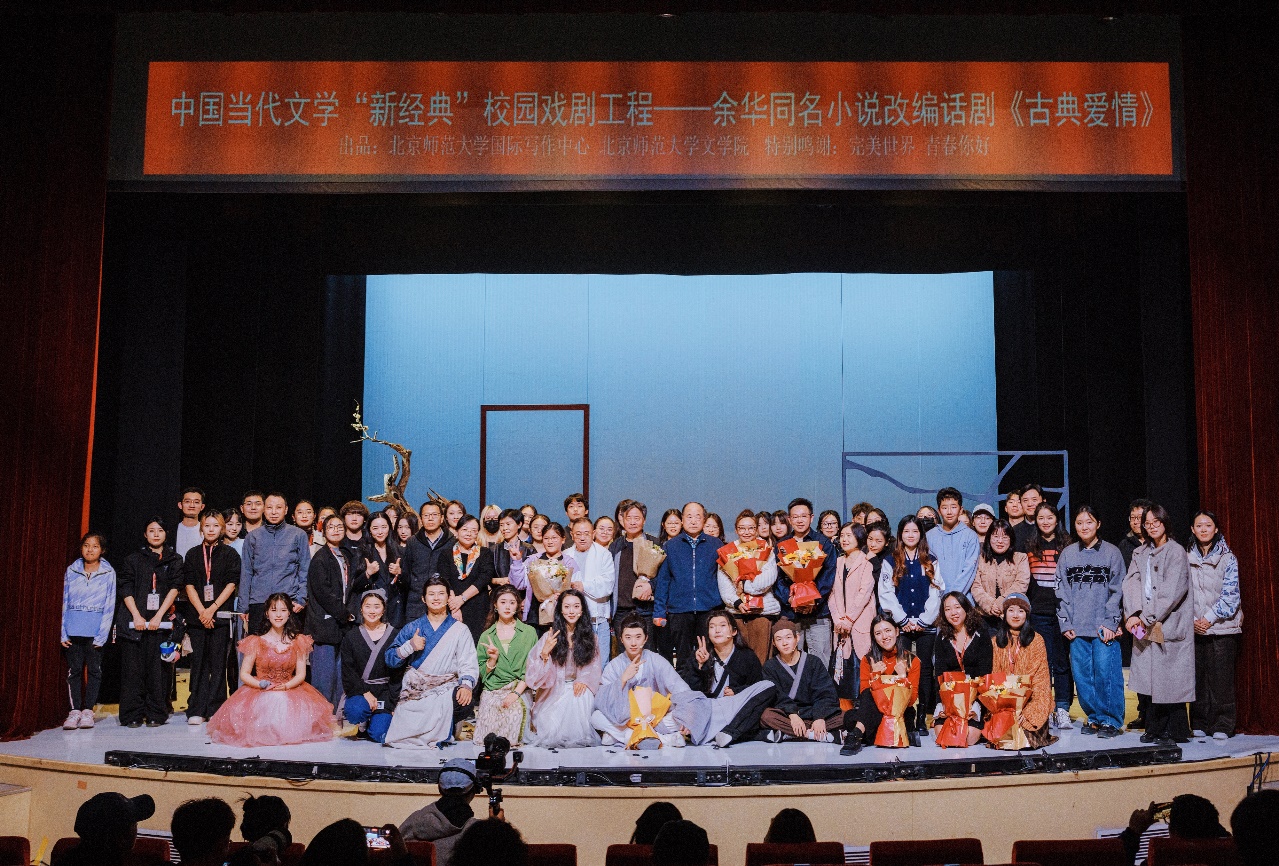 影与灯里,谛听先锋回响;笑和泪中,共话青年激荡。2024年10月19日至21日,根据余华同名小说改编的话剧《古典爱情》在betway·必威西汉姆联北国剧场连演三天,与观众惊艳相见。这是继2021年北师大版话剧《我们的荆轲》首获成功以来,betway·必威西汉姆联国际写作中心影视戏剧工作坊“中国当代文学‘新经典’校园戏剧工程”重磅推出的又一力作。该剧旨在通过文学与戏剧的跨界融合,接续中国当代先锋文学经典对爱情、武侠等重要命题的阐释路径,以青年视角、青年方法、青年腔调传递当代社会思潮与价值理想,为充分激发校园戏剧活力、呈现文艺多重效能、推动文学经典的时代化解读与大众化传播贡献北师大力量。