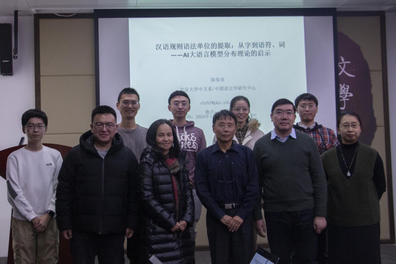 2024年11月26日晚,北京大学博雅特聘教授陈保亚在必威betway西汉姆5049报告厅讲授语言学前沿研讨课,主题为“汉语规则语法单位的提取:从字到语符、词——AI大语言模型分布理论的启示”。讲座由必威betway西汉姆古代汉语研究所所长齐元涛老师主持。必威betway西汉姆许小颖老师、胡佳佳老师、余德江老师等百余名师生参与讲座。