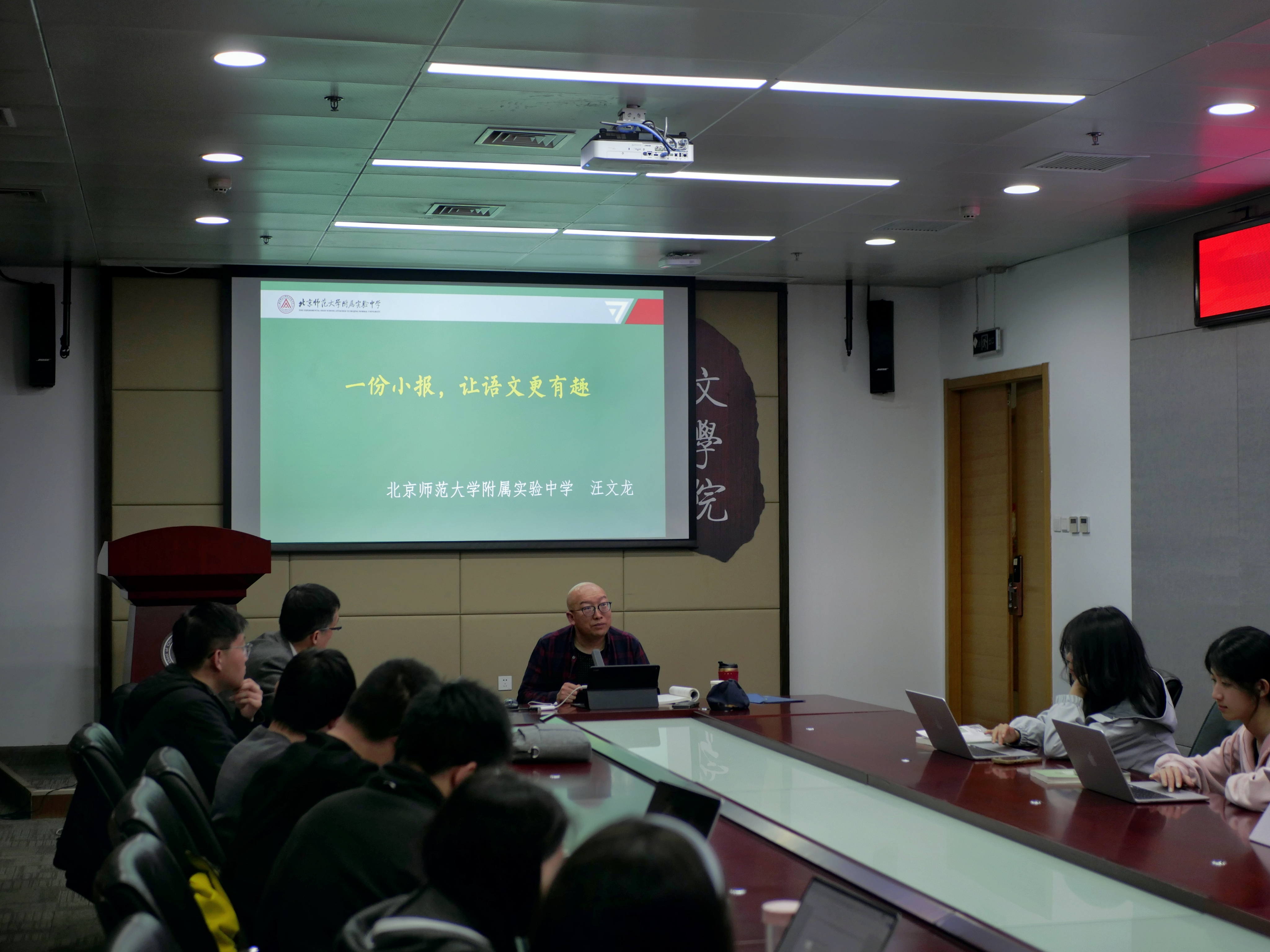 讲座伊始,汪文龙老师指出语文教学难度较高的特点与当前面临的现实困境,并向同学们推荐了语文教学的相关公众号及学术刊物。汪文龙老师认为,当今语文课堂的重点应从“师本位”转向“生本位”。由此,他提出了“单元引领、群文导向、联读为重、单篇为基”四个教学关键词与“研究教材、引入戏剧”“研究学生、技术赋能”“研究时代、制作小报”等具体抓手。在讲座过程中,汪老师结合《红楼梦》《论语》整本书阅读、《范爱农》文本精读、“谈信仰”主题群文阅读、小说创作接龙、“伏脉千里杯”原创大赛、经典戏剧公演等特色活动,向同学们展现了语文教学的丰富面相。此外,汪老师向聆听讲座的各位同学赠送了自己的著作《做语文教育的“本手”》,以便同学们更好地理解讲座内容和提升专业素养。