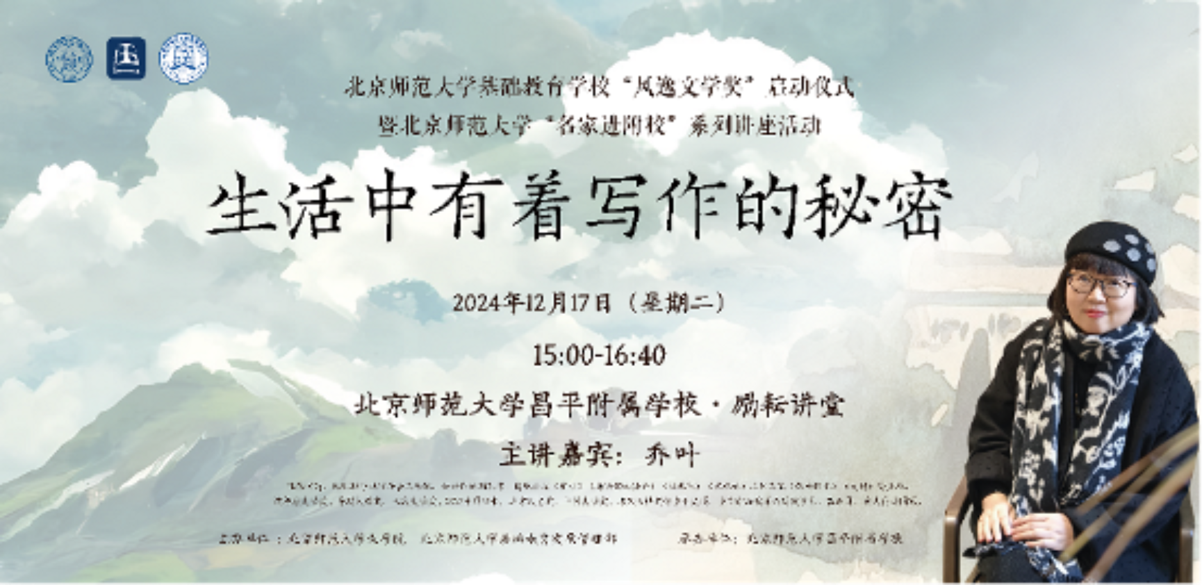 2024年12月17日下午,betway·必威西汉姆联基础教育学校“风逸文学奖”启动仪式暨betway·必威西汉姆联“名家进附校”系列讲座活动在betway·必威西汉姆联昌平附属学校顺利举办。必威betway西汉姆联合betway·必威西汉姆联基础教育发展管理部,特别邀请北京市作家协会副主席、茅盾文学奖获奖作家乔叶走进学校,带来专题讲座《生活中有着写作的秘密...