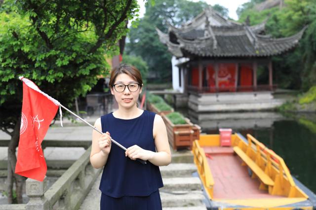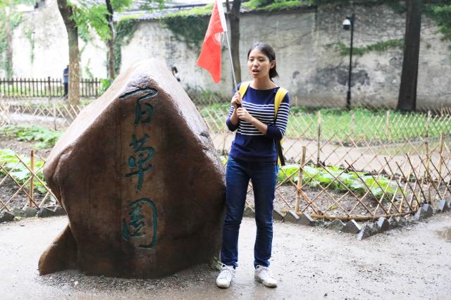 在沈园,古代汉语专业的徐旖旎同学以宋井亭匾额上的“井”字特点为例,介绍了民间对陆唐二人爱情悲剧的阐释,讲述了沈园与陆游、唐琬二人的渊源。
