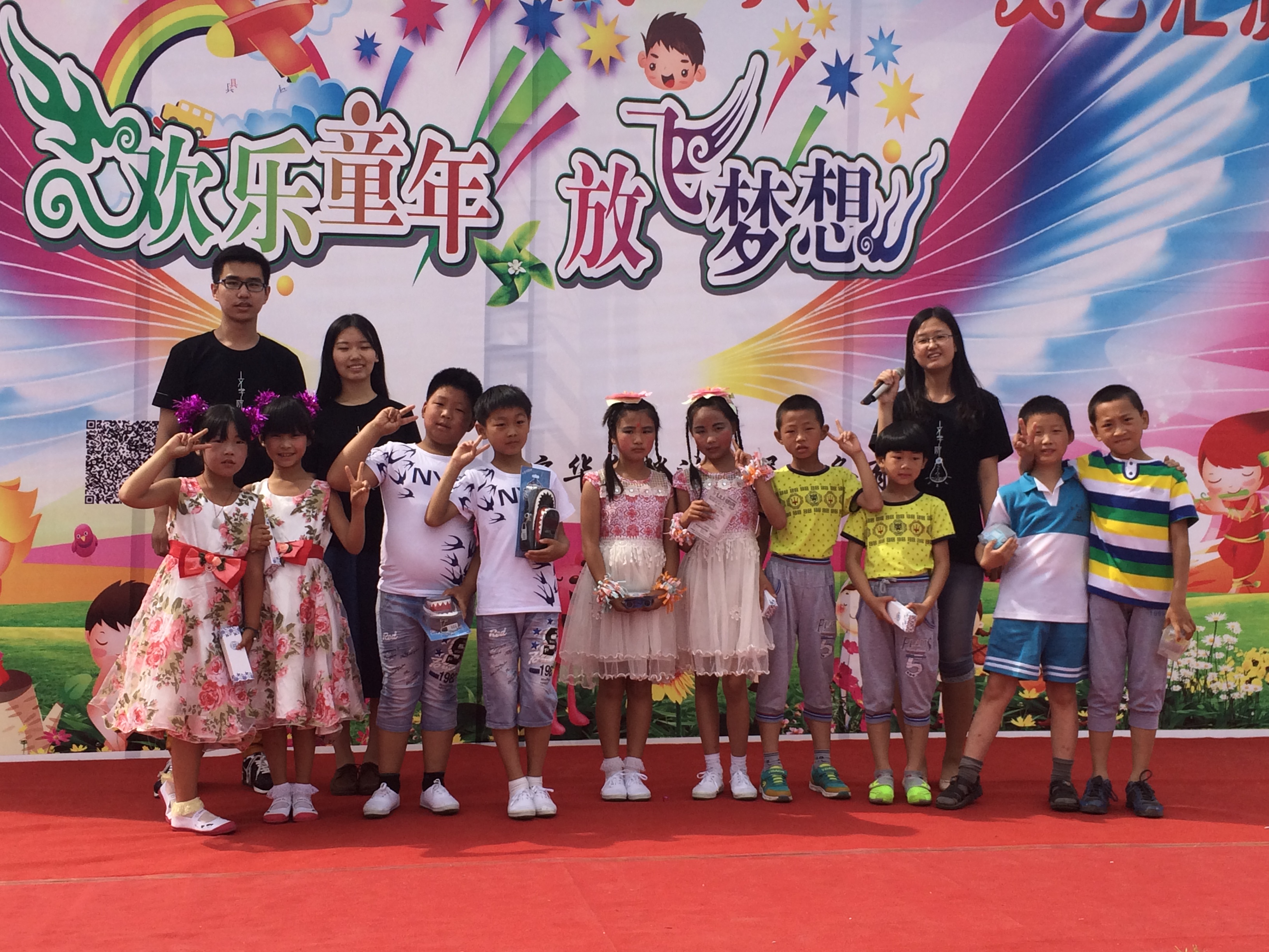 七点半,利民学校庆祝六一儿童节演出准时开始,孩子们在台上载歌载舞,充满了活力与朝气。必威betway西汉姆分团委爱心志愿者小分队负责组织演出的互动环节,设计了“你来比划我来猜”的游戏。互动游戏环节调动了孩子们极大的热情,全场三分之二的孩子们都举手参与,最后志愿者从这些热情洋溢的孩子们中选出了六组,进行游戏。考虑到孩子们的年纪和学习程度,志愿者小分队设计了一些贴近孩子生活的词语,如长颈鹿、吃西瓜等,台上参与的孩子们一会儿做出孙悟空张望的动作,一会儿又做出大口吃西瓜的动作,按照卡片上给出的文字模仿得惟妙惟肖,带动了全场的气氛。