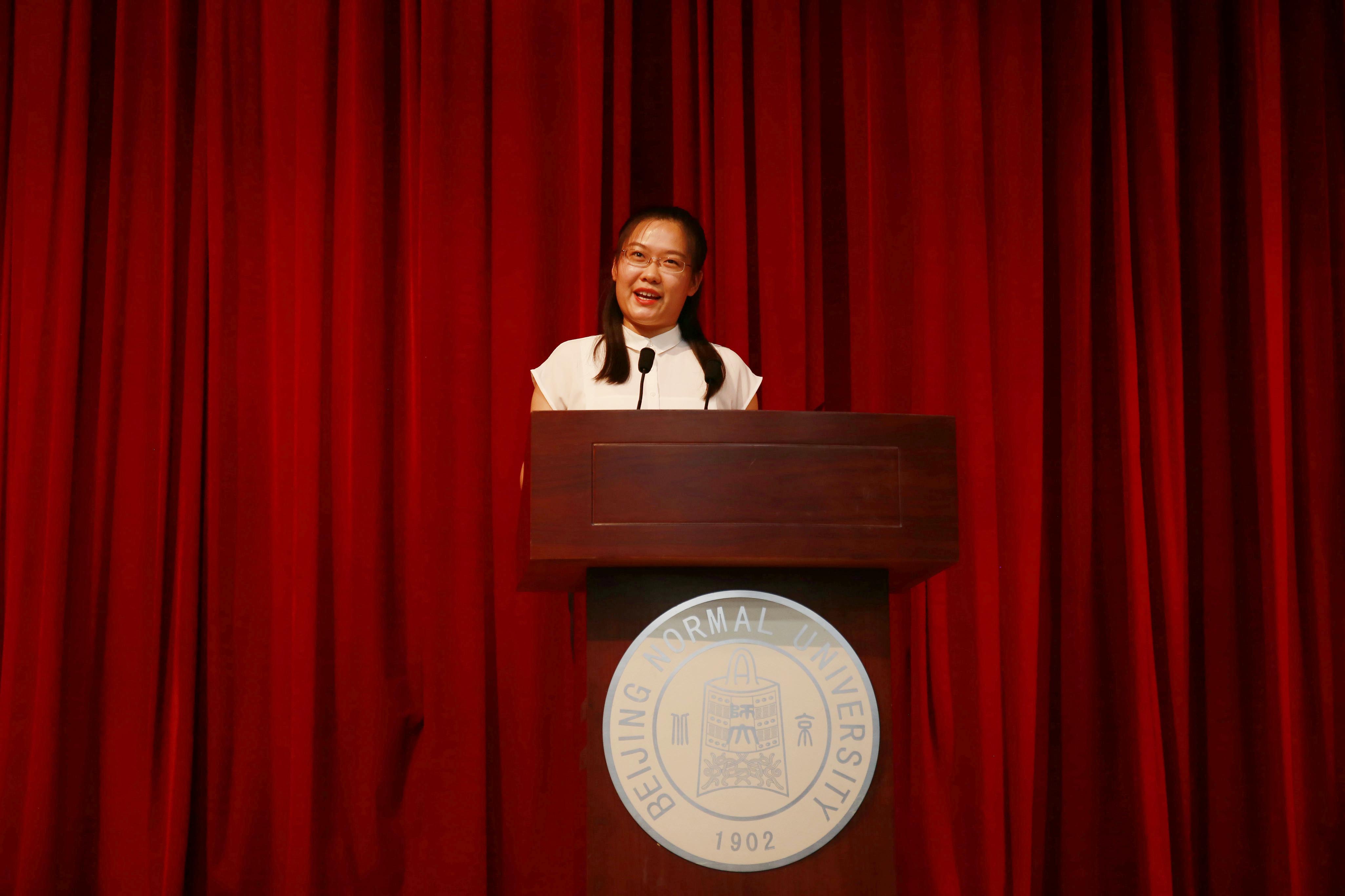 在校生代表、现代文学专业博士生赵静同学为新生讲述了美好的师大故事,向同学们分享了学习方法和生活经验。她鼓励新生要惜时,在有限的时间里充实自我、提升自我;要惜人,珍惜大学生活上的领路人,孜孜求学、不耻下问;要多思多想多交流,进行思维碰撞;要加强锻炼,拥有一个强健的体魄和真诚富足的人生。