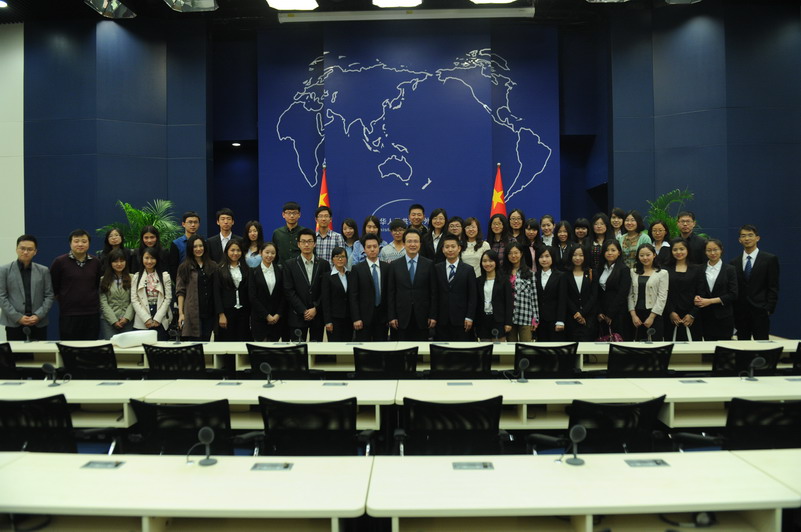 外交部亚洲司、新闻司、翻译室、干部司等四位青年干部与学生进行了座谈,介绍了周边外交、公共外交、外交翻译和外交部干部考录等工作,生动讲 述外交工作的台前幕后、外交人员的酸甜苦辣,并回答了同学们关于外交形势、报考就业等方面的问题。座谈会气氛热烈,互动积极,交流深入。