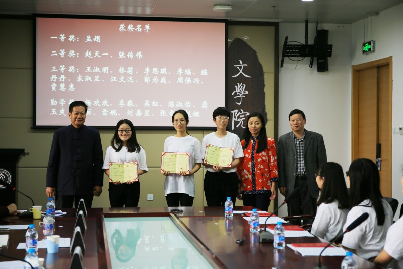 一等奖获得者、2013级本科生孟娟,三等奖获得者、2015级研究生李瑶代表获奖学生发言,表达了对捐赠者的感恩,对学校和老师引导他们走向学习经典之路的感激。孟娟深情感慨到:从大一到大四,国学经典丰厚着她的大学生活,她可以流利背诵整本《论语》及《学庸》《老子》,熟读《诗经》《周易》,这个奖项的获得,是对她大学学习生涯的肯定和鼓励。李瑶讲述了她作为志愿者在秀强集团的学习期间,对于志愿者的道德境界的理解和感动,表达了她对传统文化浸润下的秀强人所展现的人人积极向上,彼此和谐互助的良好精神风尚的崇敬。其他获奖同学也纷纷发言,分享与经典结缘的经历和研习国学传统文化带给她们的影响和改变。最后,全体获奖同学集体背诵了《大学》。