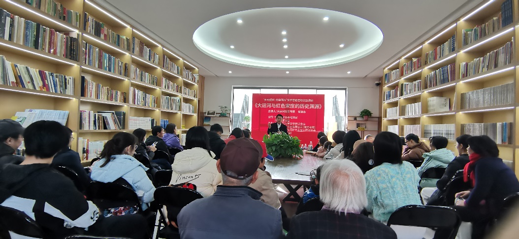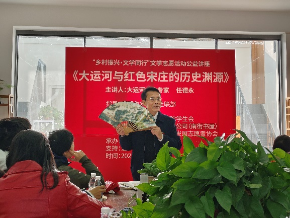 随后,大家来到宋庄镇大庞村的“南街书屋(运河人家)”,聆听任德永老师《大运河与红色宋庄的历史渊源》讲座。宋庄镇的红色宋庄村与千年古村大庞村,既是大运河北端两个特殊的地理重要标志(村庄),又是抗日战争时期拉锯战的核心区域、解放战争中平津战役前线指挥部的所在地,斗争故事众多、文物遗存多样,教育意义不凡。任德永娓娓道来通州地区的城市历史变迁、地理人文、文学发展与风土人情,详细介绍了当地政府为通州文旅开发付出的努力与成效,以声情并茂的讲授为听众们铺陈开一幅通州大运河历史红色画卷,成员们受益匪浅。