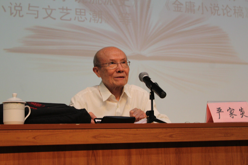 在进行了回顾总结、颁奖两个环节之后,北大著名教授严家炎老师在同学们如潮的响亮掌声中步入讲台,与同学们就“我看金庸”这一主题进行了深刻的探讨交流。首先,严家炎老师表达了自己对金庸小说的热爱,指出”在文学作品’热’之不易的背景下,金庸’热’却超越思想政治分野,热达半个世纪”,并由此引出自己对金庸小说的四点看法。在讲述期间,严老师援引金庸先生具体作品,结合作品相应现实环境与金庸先生自身的情怀品行指出金庸小说是有思想的娱乐品,是古代题材渗入现代精神的结合,是从浪漫主义走向象征寓意的代表,且具有从未有过的高度文化品位。最后,严家炎老师以庄子的瑰丽想象、精妙哲思、奇妙境界与金庸先生的作品相融,说出了“金庸小说不仅是单项冠军,还是全能冠军“的妙语,赢得了全场如雷掌声。而紧接着的观众提问更是密切结合经典文学与当代影视等话题极大地拓广丰富了讲座内容,带给同学们一场思想上的盛宴。