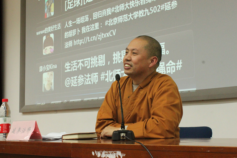 对于处在人生转折阶段的大学生来说,“人生的意义是什么”似乎一直是困扰他们的问题。对此,延参法师给出了自己的答案:“人生是努力后的接受,是自己去思考,然后实践。人生就是胖与瘦之间来回晃。”当谈到对生活的态度时,他用“心安”二字概括。“爱吐槽,你将收获埋怨。爱埋怨,你将收获伤感。不要挑剔生活,生活其实就是一场淘宝,淘干了拉倒。”在与现场的互动中,有不少同学提出了自己的“感情问题”,而早已断绝红尘的延参法师也慷慨解疑:“谁是你的感情归宿?若干年后和你埋在一起的人。不要把希望寄托在别人的承诺上,不要总是活在浪漫里,要活在简单和真实里。”延参法师的小徒弟更是现场上演“佛门好声音”,以一首刘德华的《悟》将全场引向高潮,或许这首歌恰恰表达了延参法师对人生的理解,“人生是一场领悟”。